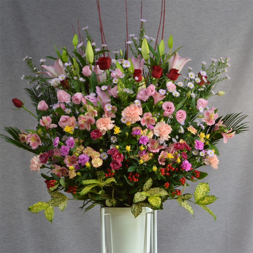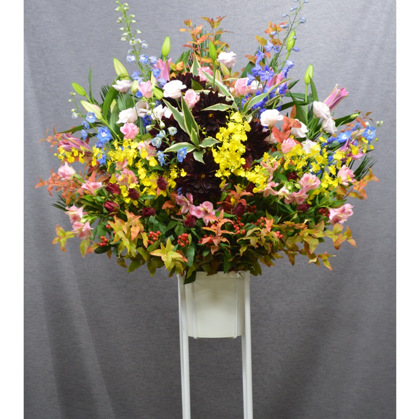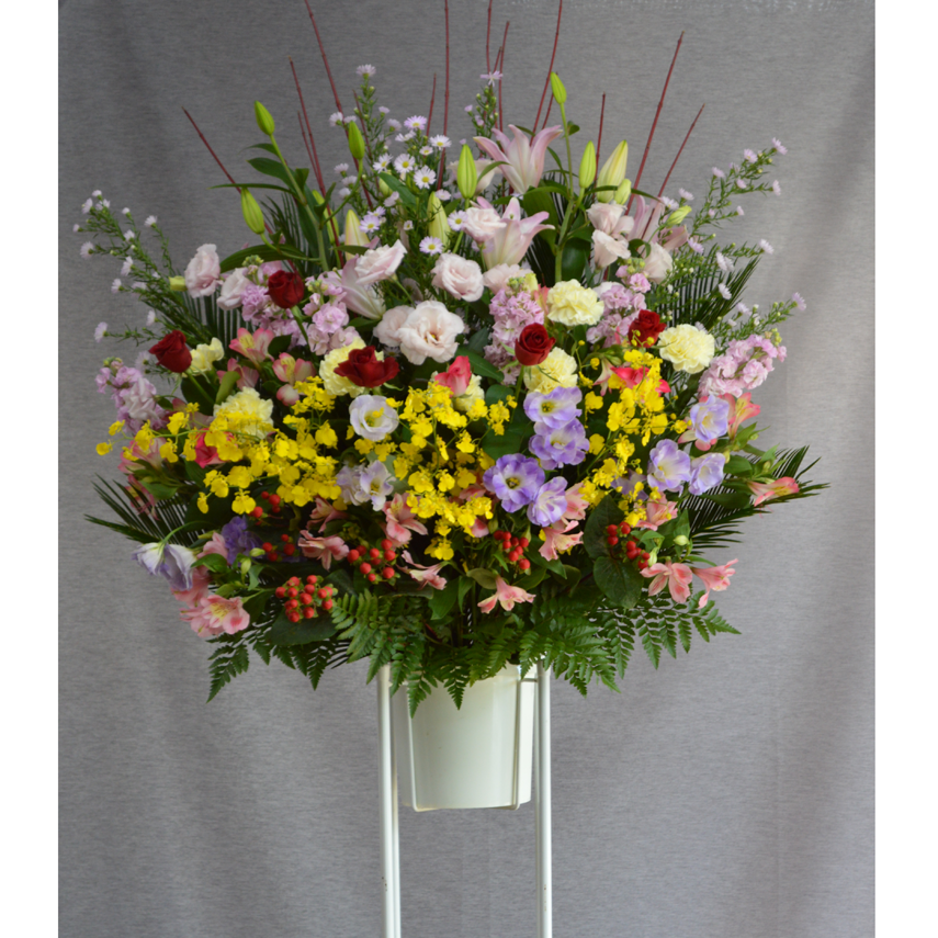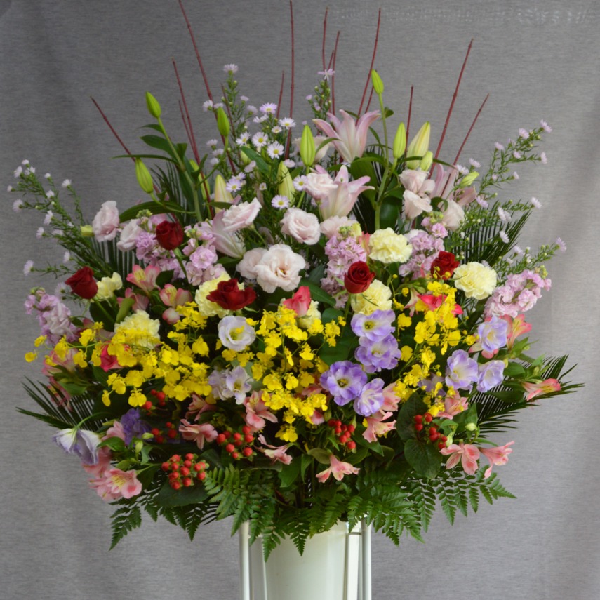 お祝いごとにおすすめの、台付きの豪華なお花です。